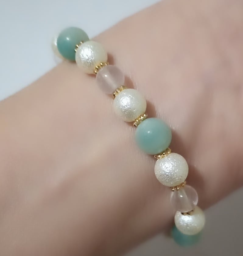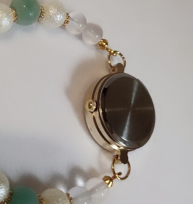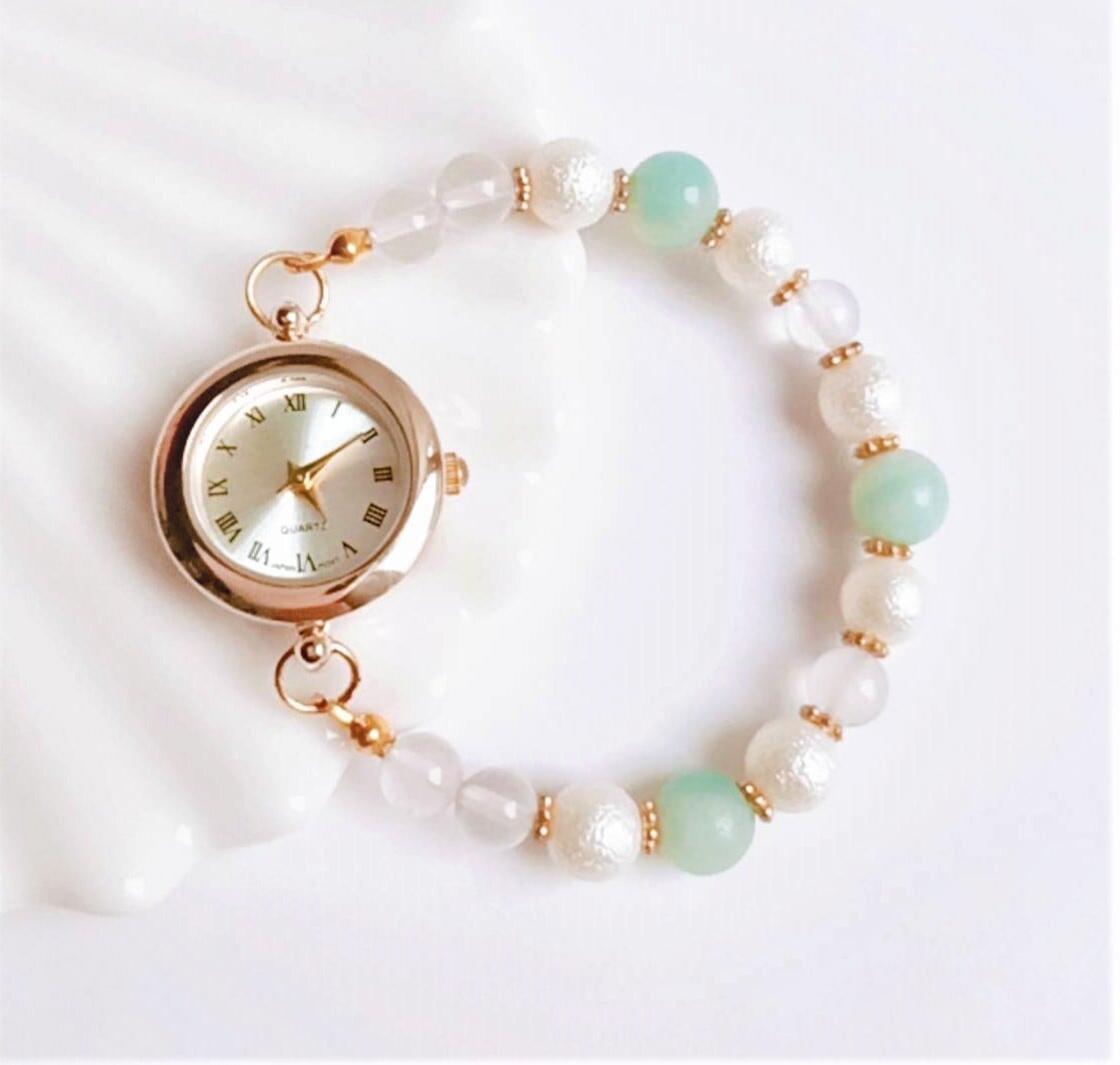 パワーストーン、アベンチュリン(優)とローズクォーツ(愛)、コットンパールをあしらった腕時計。<税込・送料無料・受注制作>